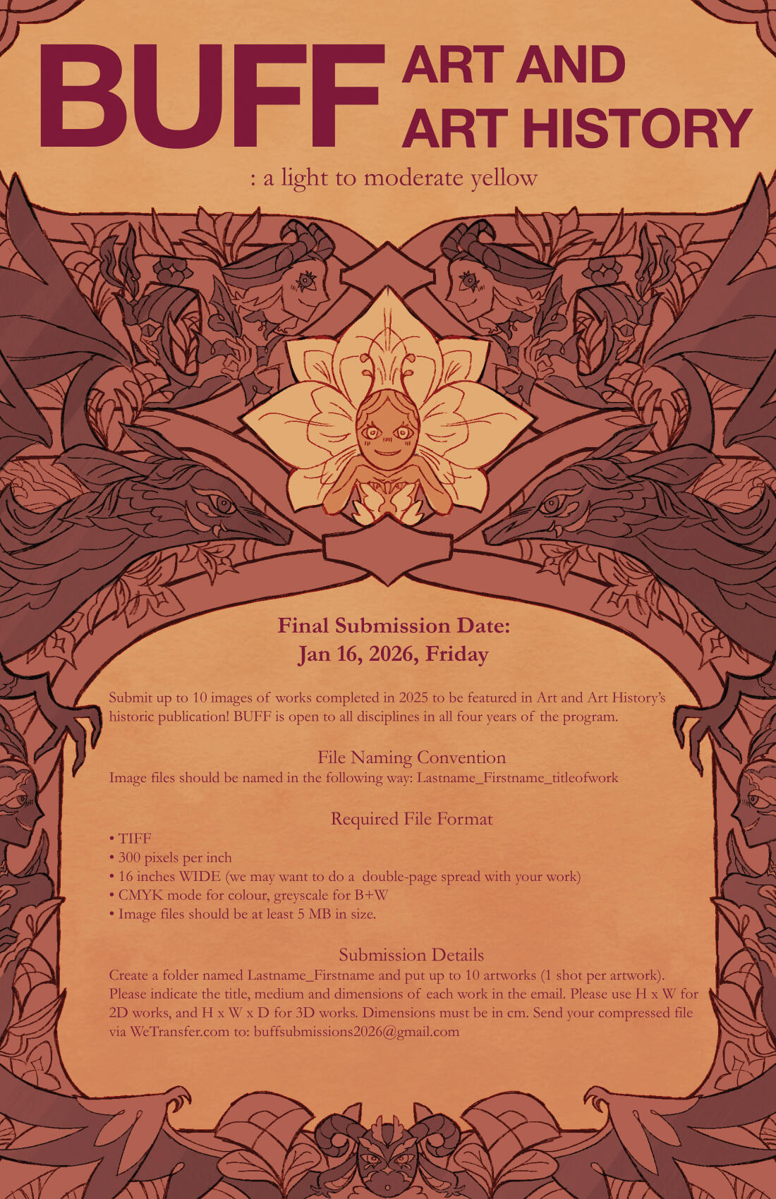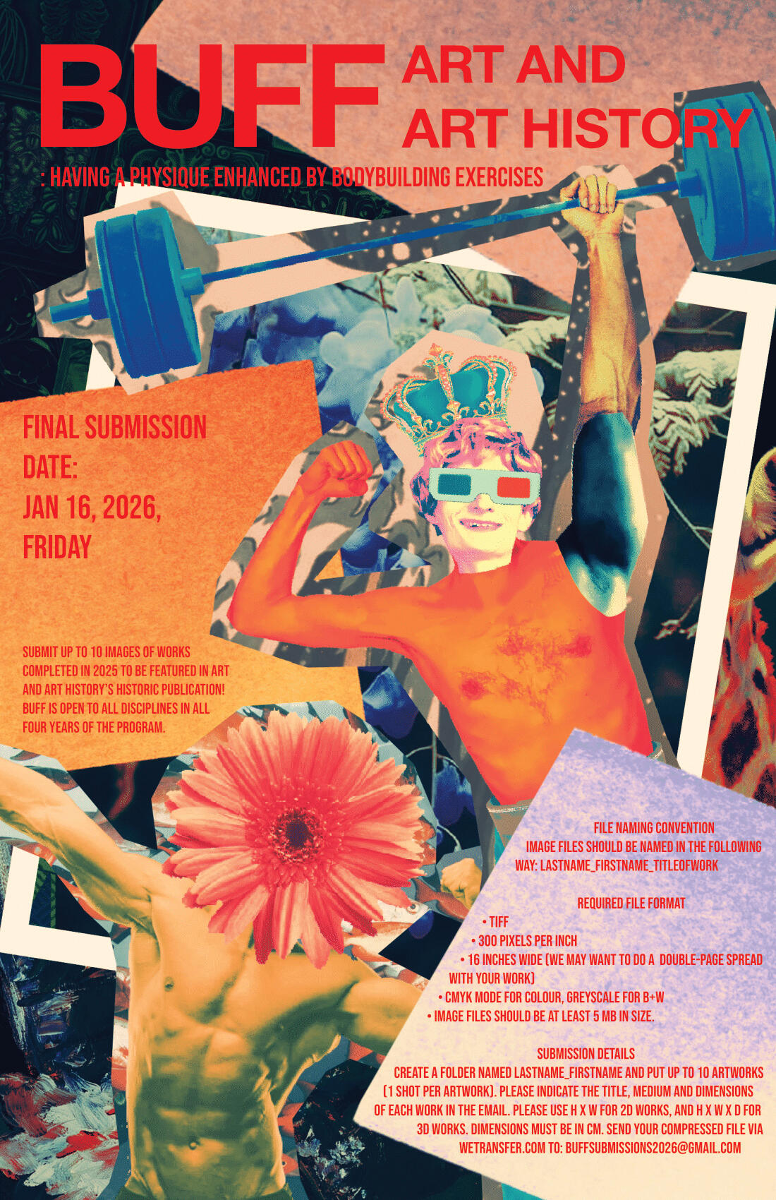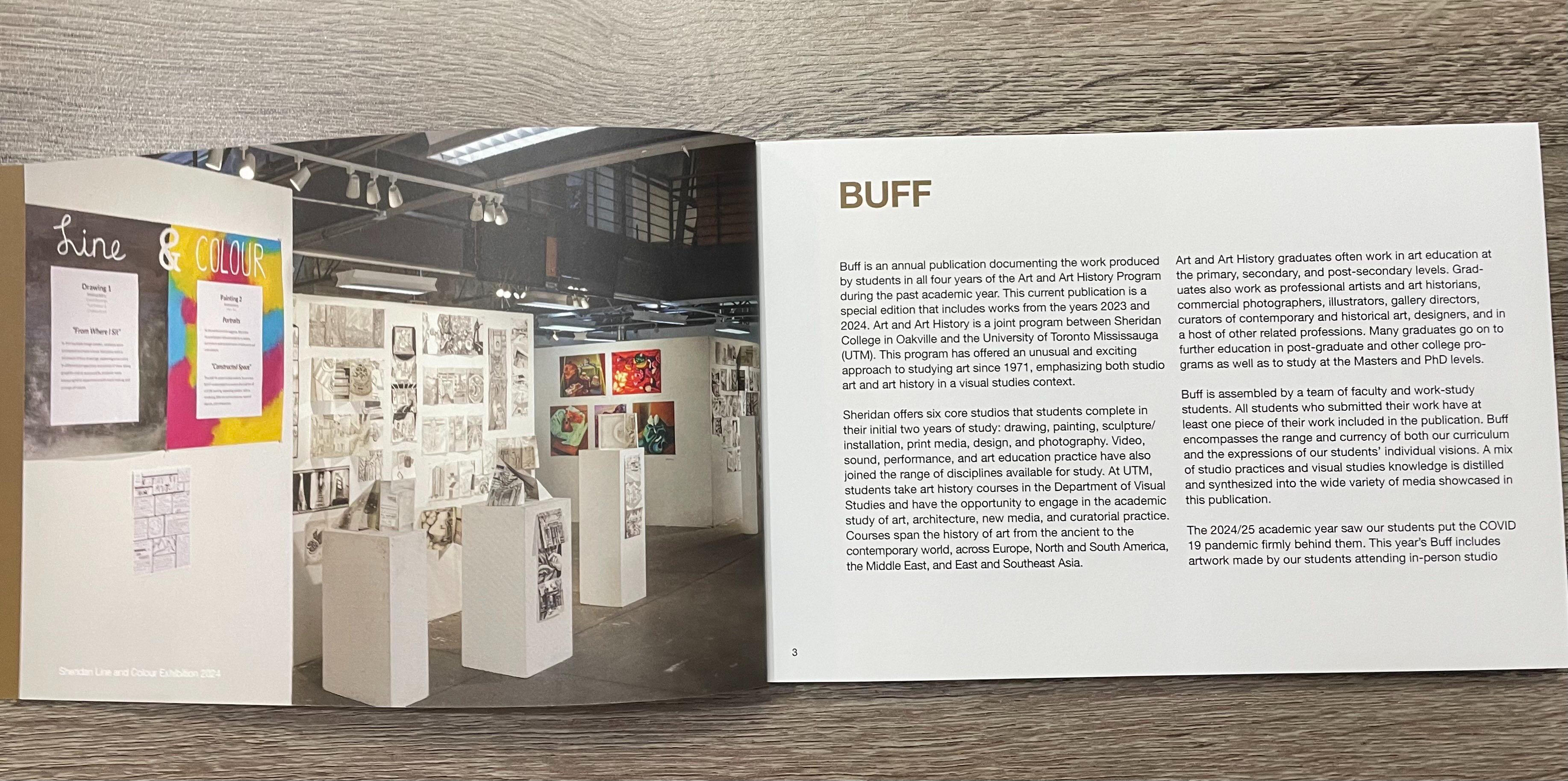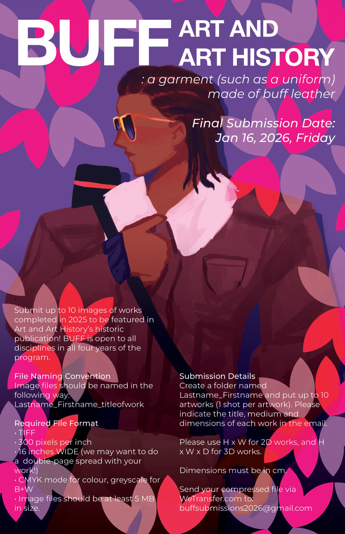 BUFF is an official art book publication commissioned by University of Toronto in collaboration with Sheridan College that I am currently working on as organizer, editor, and advertiser. The book features the artworks of students enrolled in the 2025-2026 term under the department of Art and Art History. As submissions are still currently being collected from students across the department, I worked on these mini handout flyers sized 8.5" x 5.5" in order to help garner more submissions. Each one features a different definition of the word "Buff", and utilizes a broad range of styles that embody the creative spirit of students.