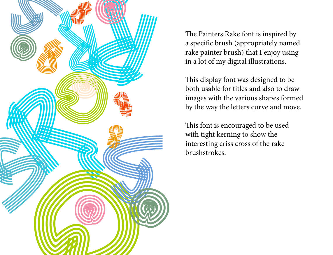 This font was designed for a dual purpose: to be used as a striking display font, or to be used to make images with its wide variety of shapes that curve and bend in various directions. As the name suggests, its design was inspired by rake brushes commonly used in digital illustration.